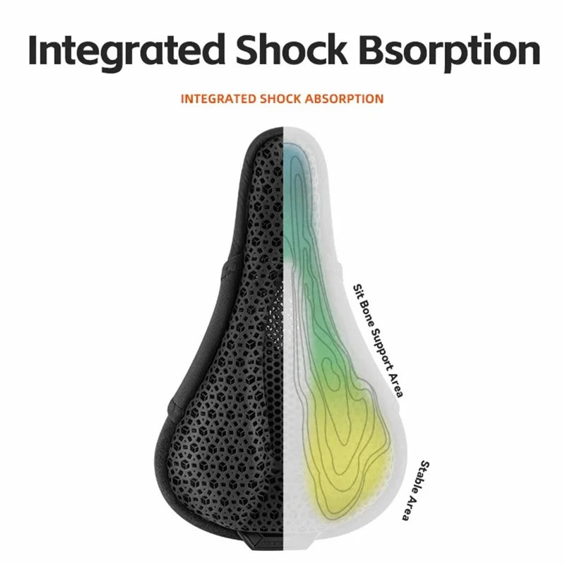 The saddle cover uses a polyurethane composite material and employs DLP (Continuous Digital Light Processing) printing technology, with elastic hollow grid structures for shock absorption, ventilation, and strong rebound