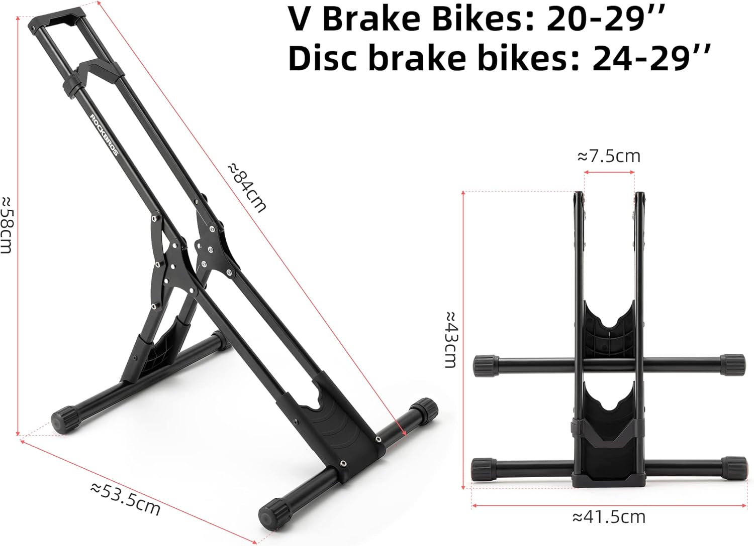 No deje más sus bicicletas apoyadas contra una pared o volcadas por el viento. El soporte de bicicleta de suelo ROCKBROS ofrece una solución de almacenamiento práctica y segura para sus bicicletas de montaña y de carretera de 20 a 29 pulgadas, ya sean equipadas con frenos en V o de disco.
