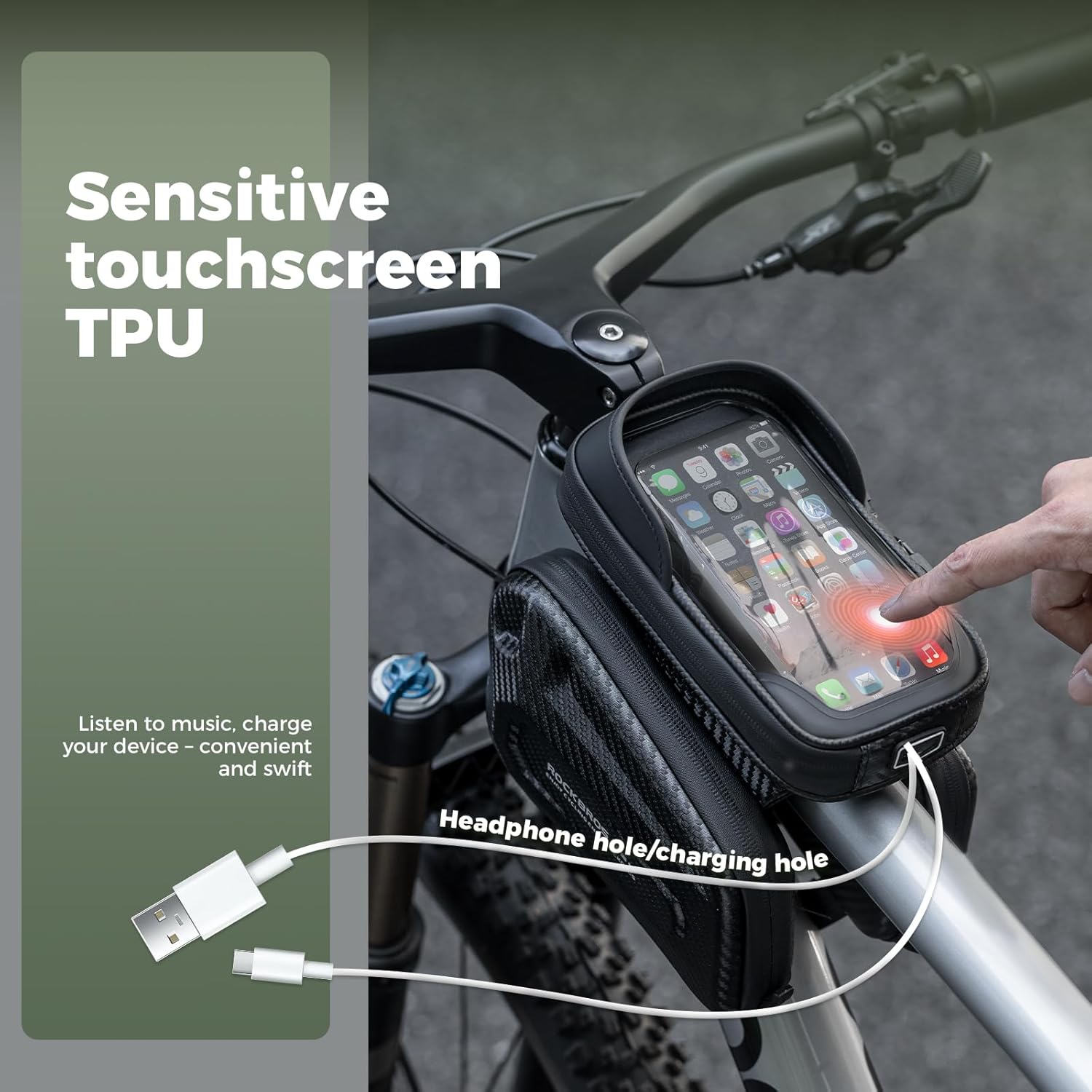 Descubre la bolsa de cuadro para bicicleta ROCKBROS, diseñada para ciclistas modernos. Este accesorio combina un espacio de almacenamiento inteligente con un soporte para teléfono práctico, permitiéndote mantenerte conectado y seguro en la carretera.