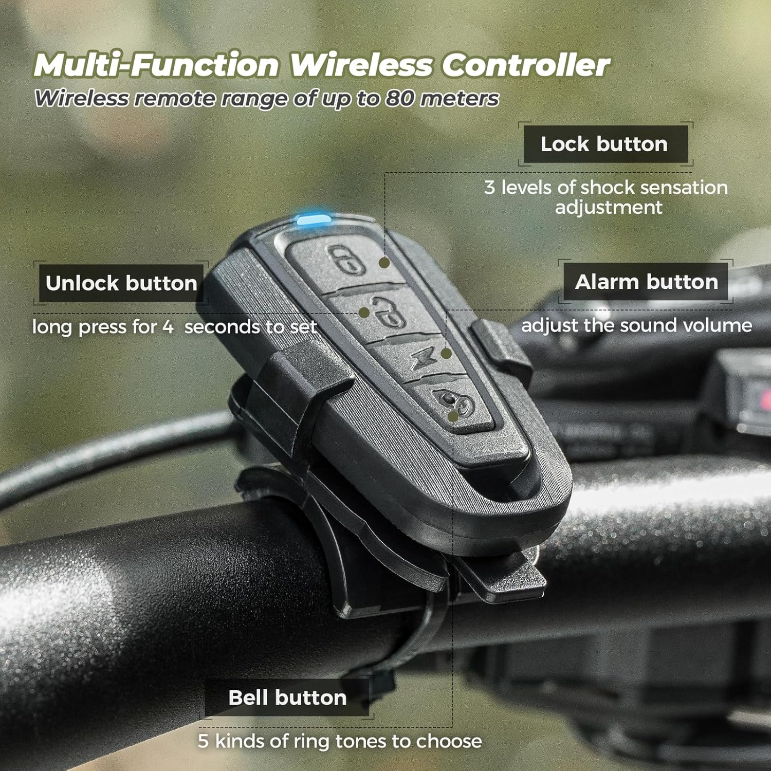 El conjunto viene con un mando a distancia inalámbrico para un uso sencillo. Cuenta con cuatro botones: Armado, Desarmado, Alarma de Pánico y Timbre. El mando tiene un alcance impresionante de 80 metros, incluso a través de paredes, lo que permite localizar fácilmente su bicicleta en un estacionamiento.