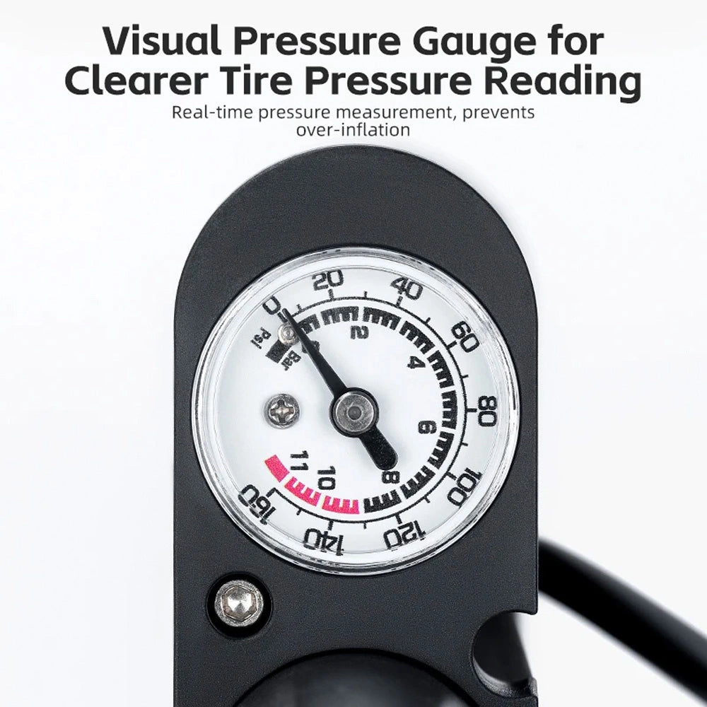 Il piede pieghevole e la maniglia rimovibile facilitano il trasporto e la conservazione. Possiede un lungo cavo anti-groviglio che vi permette di collegare facilmente la pompa alla valvola della vostra bici.