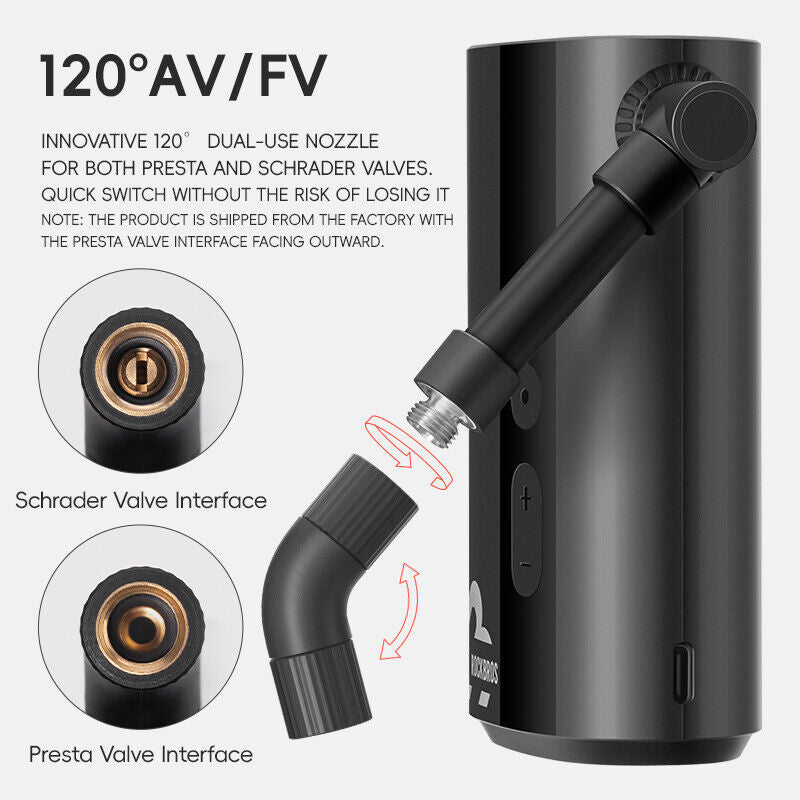 La pompa è progettata per essere universale. Integra un nuovo design di tubo intelligente che combina le valvole Presta e Schrader in una sola. Puoi passare facilmente da un tipo di valvola all'altro semplicemente ruotando il raccordo, senza bisogno di adattatori multipli.