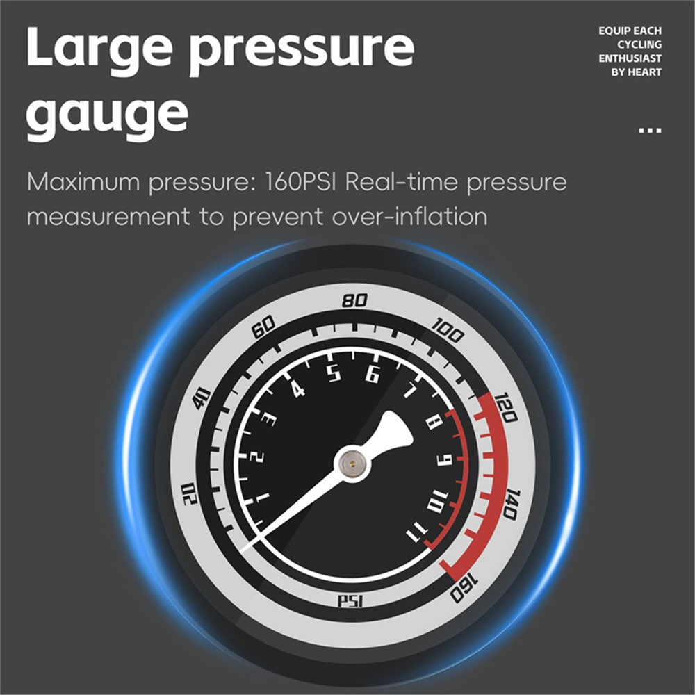 Il quadrante ampio facilita la lettura e rende il monitoraggio della pressione più intuitivo. Compatibile con valvole Presta e Schrader, questa pompa universale è adatta sia per biciclette (MTB, strada, elettriche) che per moto, auto, palloni, ciambelle gonfiabili o giocattoli gonfiabili.