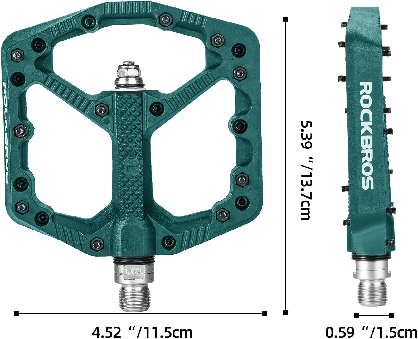 Con una piattaforma larga 110 mm, questi pedali offrono un supporto ottimale per i tuoi piedi, garantendoti una guida più stabile e sicura. Per una massima aderenza, la superficie è dotata di motivi antiscivolo e 10 tacchetti su ogni lato, riducendo così il rischio di scivolamento anche in condizioni di bagnato o fango.