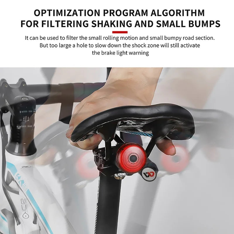 Questa luce posteriore integra un sensore ad alta precisione combinato con un algoritmo avanzato che gli permette di rilevare anche la frenata più leggera. In base all'angolo orizzontale del tubo sella, calibra automaticamente l'algoritmo per identificare le sezioni in salita e in discesa, mantenendo una precisione di frenata costante in ogni circostanza. Può filtrare i piccoli movimenti e le strade leggermente sconnesse, evitando attivazioni inutili, ma si accenderà istantaneamente per avvertire di una frenata anche su urti più importanti.