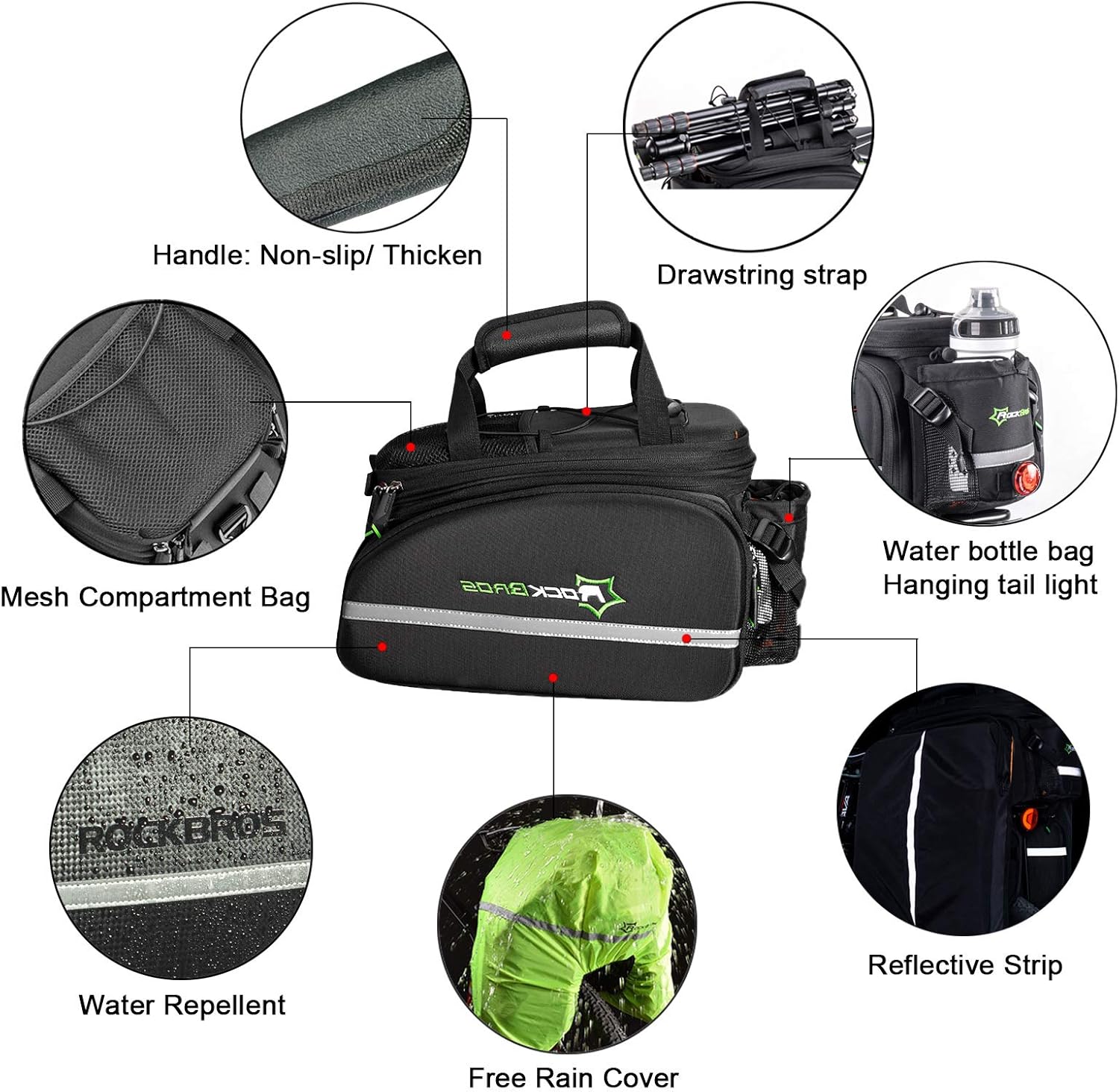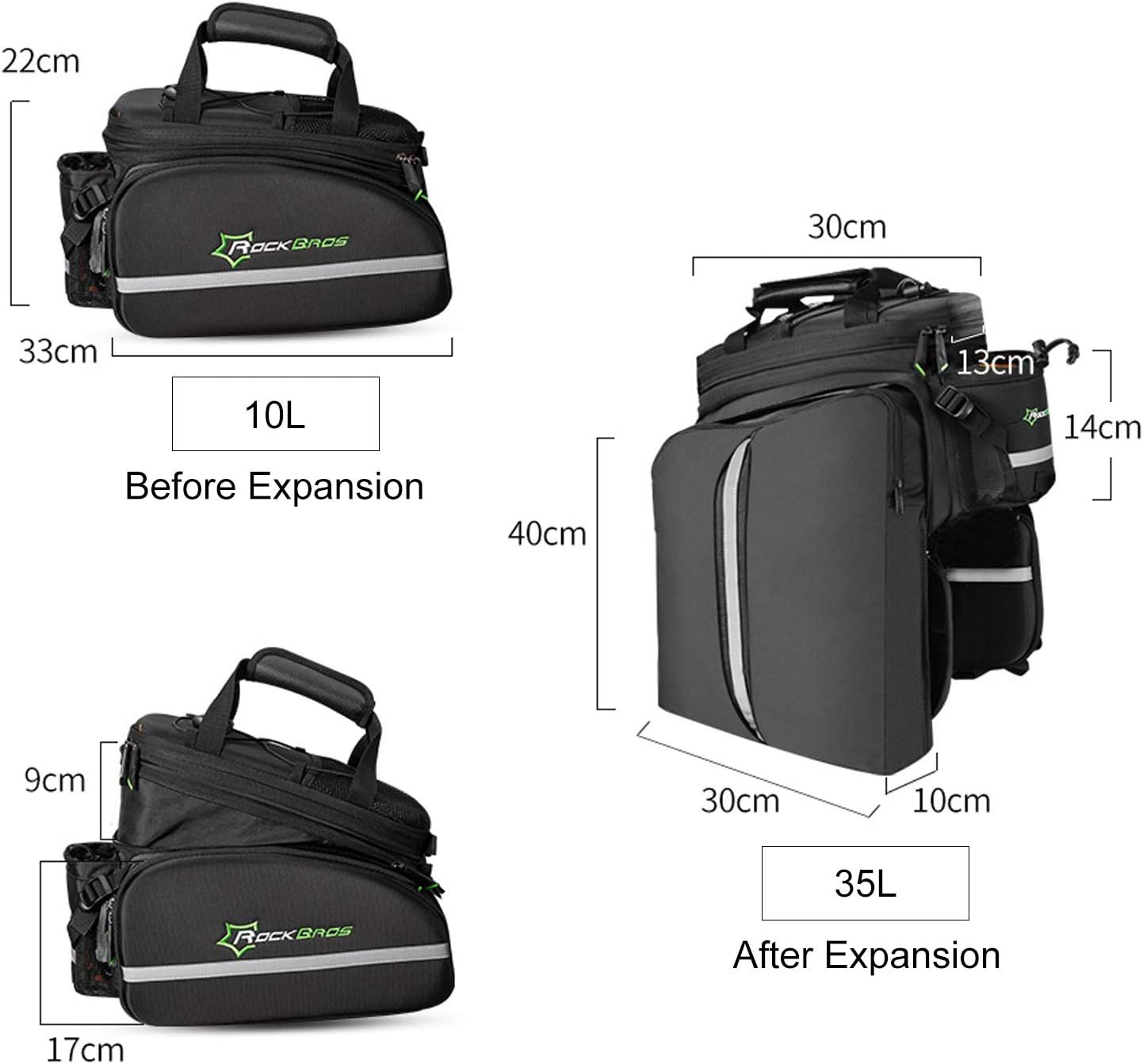 - Resistente e sicura: Resistente all'acqua in configurazione non espansa. Include una copertura antipioggia per le borse laterali. Strisce riflettenti per la visibilità notturna. Fissaggio solido con 4 cinghie.