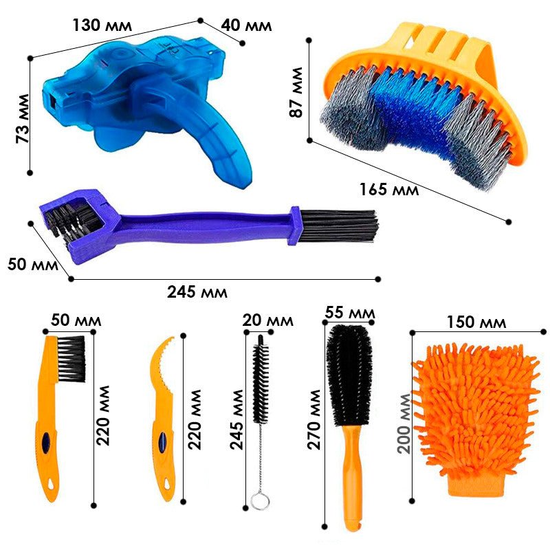 Rinkinio sudėtis Grandinės plovimo įrenginys, grandinės šepetys, ratų/padangų šepetys, rėmo plovimo pirštinė, kasetės įrankis, tikslieji šepetėliai.