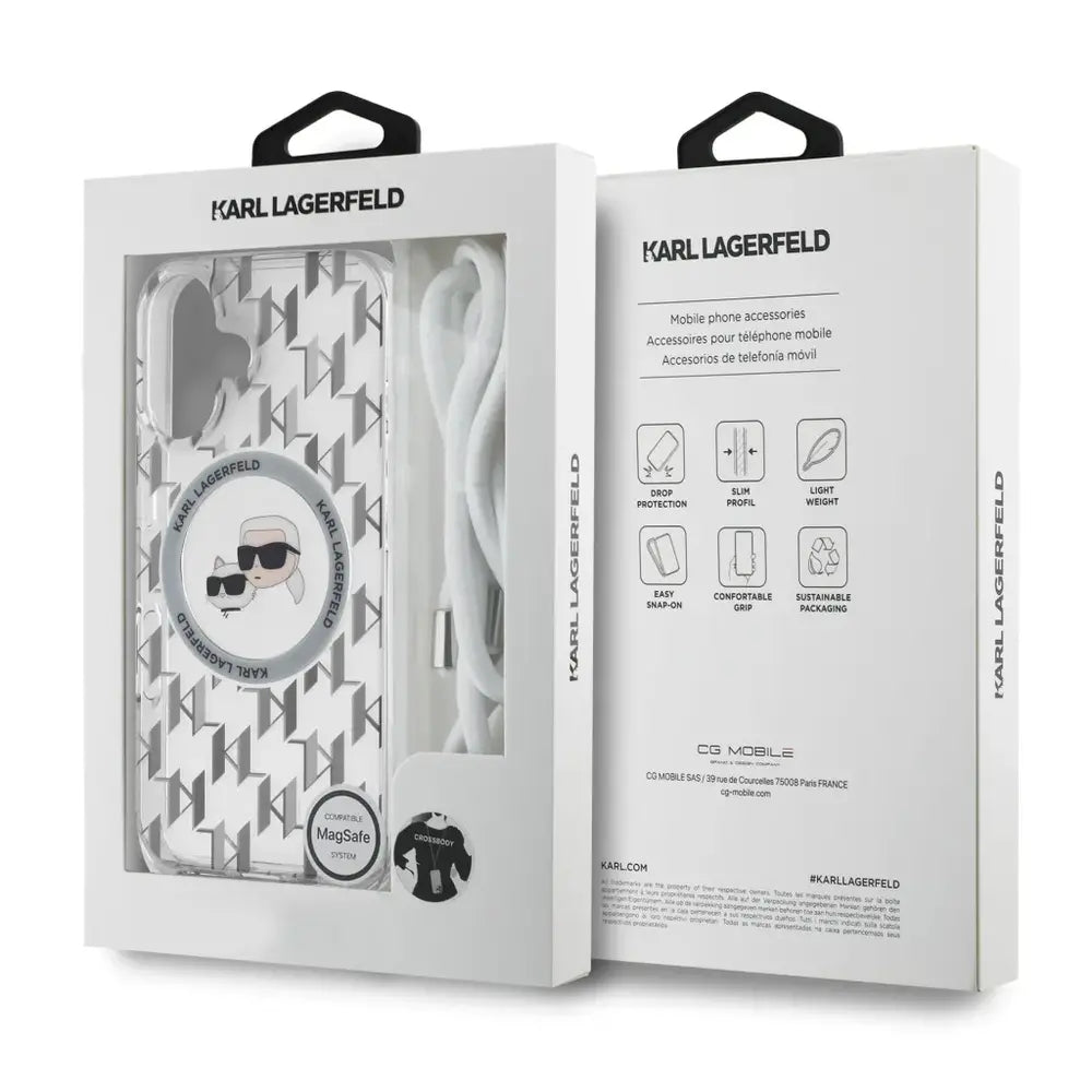 Karl Lagerfeld – Achterkant hoesje iPhone 16 – MagSafe IML – Têtes KC – Koord – Transparant