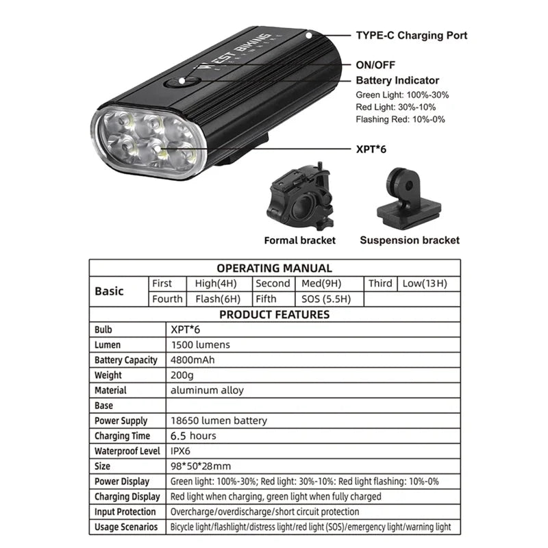 - Ultra-lumineux 1500 lumens : équipé de 6 LED XPT, cet éclairage de guidon de vélo offre une luminosité impressionnante de 1500 lumens, offrant une visibilité claire dans toutes les conditions