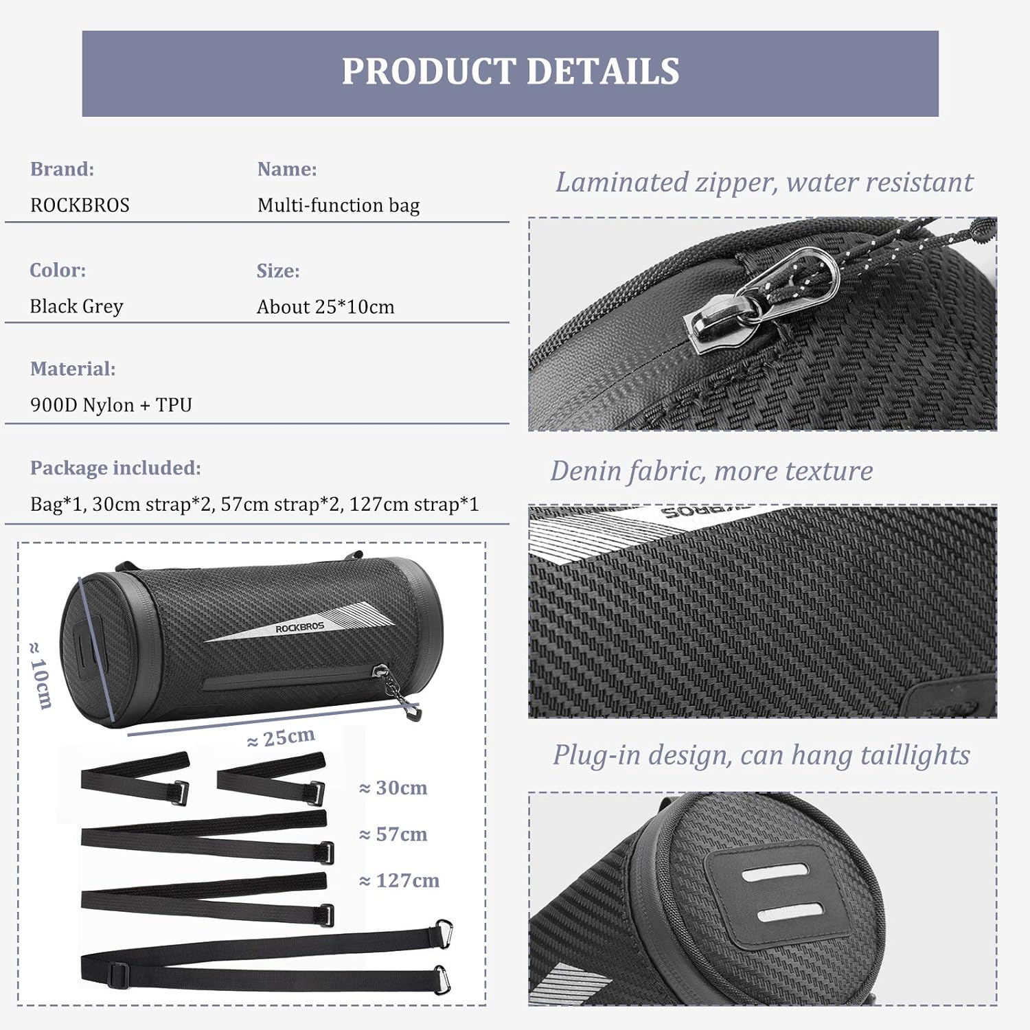 • Fixation polyvalente : 5 sangles en nylon réglables pour guidon, cadre ou selle. Peut aussi être portée en bandoulière grâce à la sangle incluse.