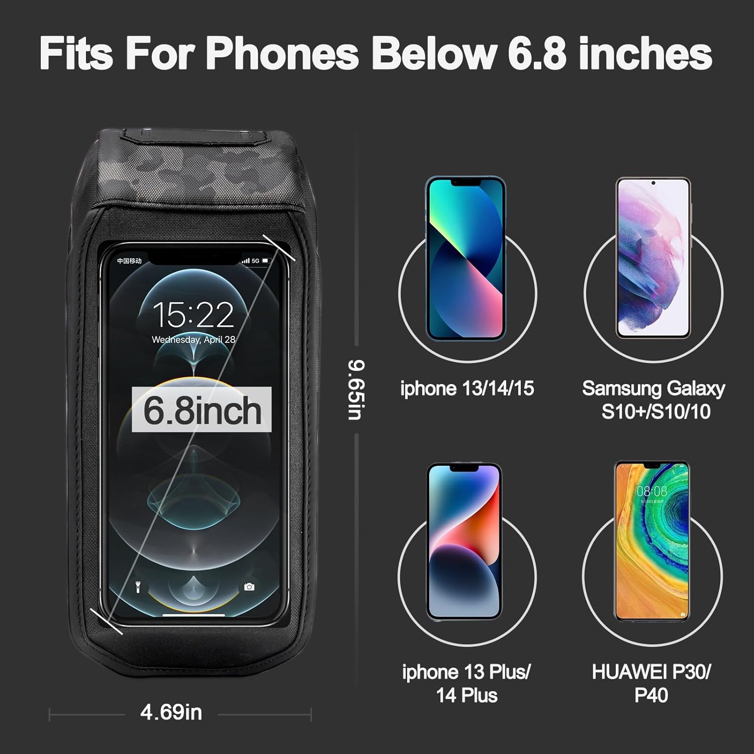 Grande capacité de 1,7 L : La sacoche offre un volume généreux pour ranger vos affaires quotidiennes : téléphone, lunettes de soleil, batterie externe, gants, etc. Des compartiments en filet à l'intérieur permettent un rangement organisé. Elle est compatible avec les smartphones jusqu'à 6,8 pouces, incluant de nombreux modèles d'iPhone et de Samsung Galaxy.