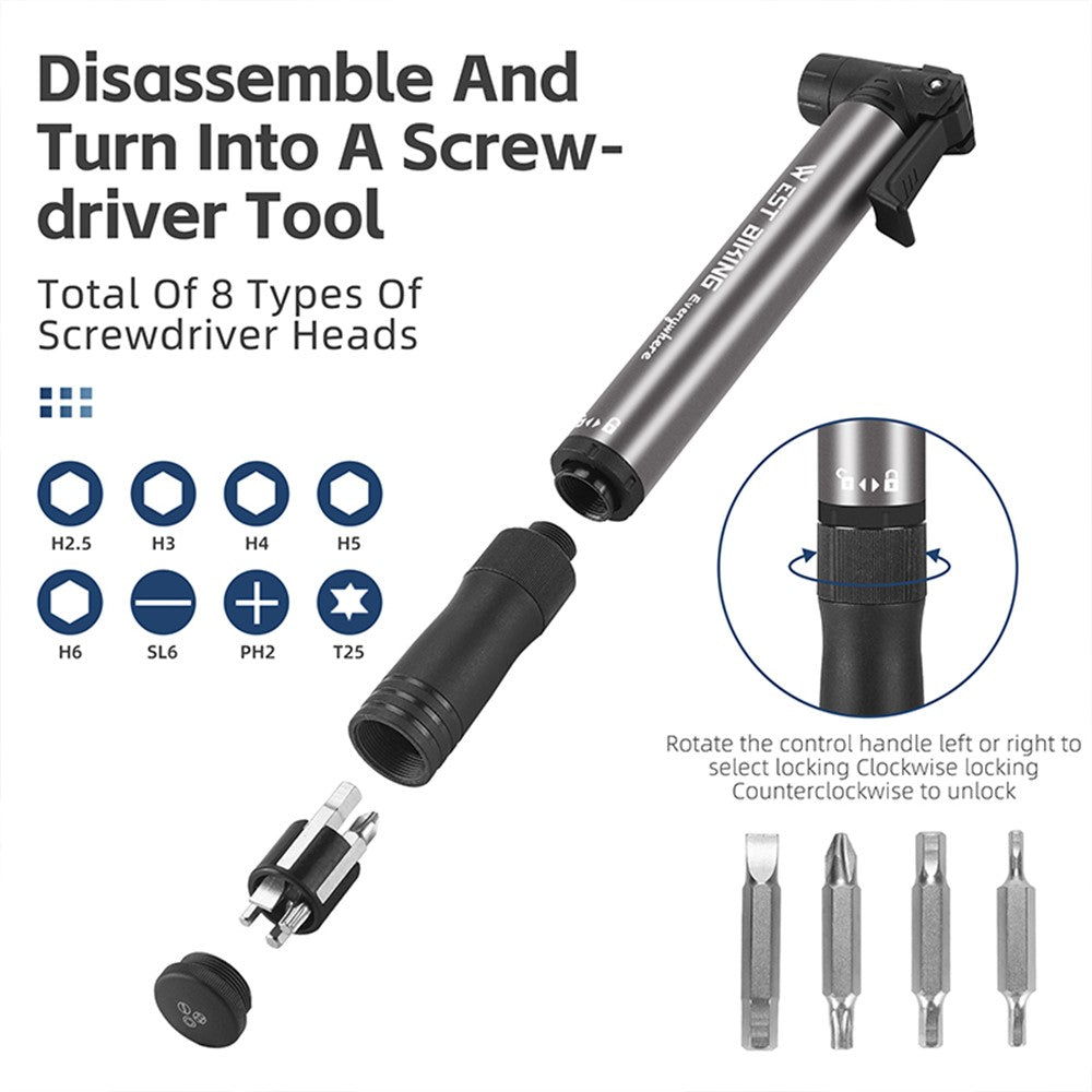 Son design détachable cache un véritable atout : plusieurs embouts de tournevis inclus (H6, SL6, H2.5, H3, PH2, T25, H4, H5), transformant cette pompe en outil multifonction idéal pour vos réparations et dépannages rapides.