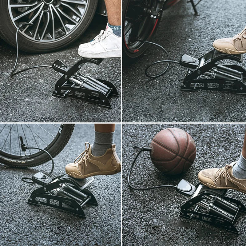 La pompe à pied à double cylindre ROCKBROS J48B-07 est un outil puissant et efficace pour gonfler rapidement et précisément vos pneus de vélo électrique, de voiture, de moto et bien plus encore.