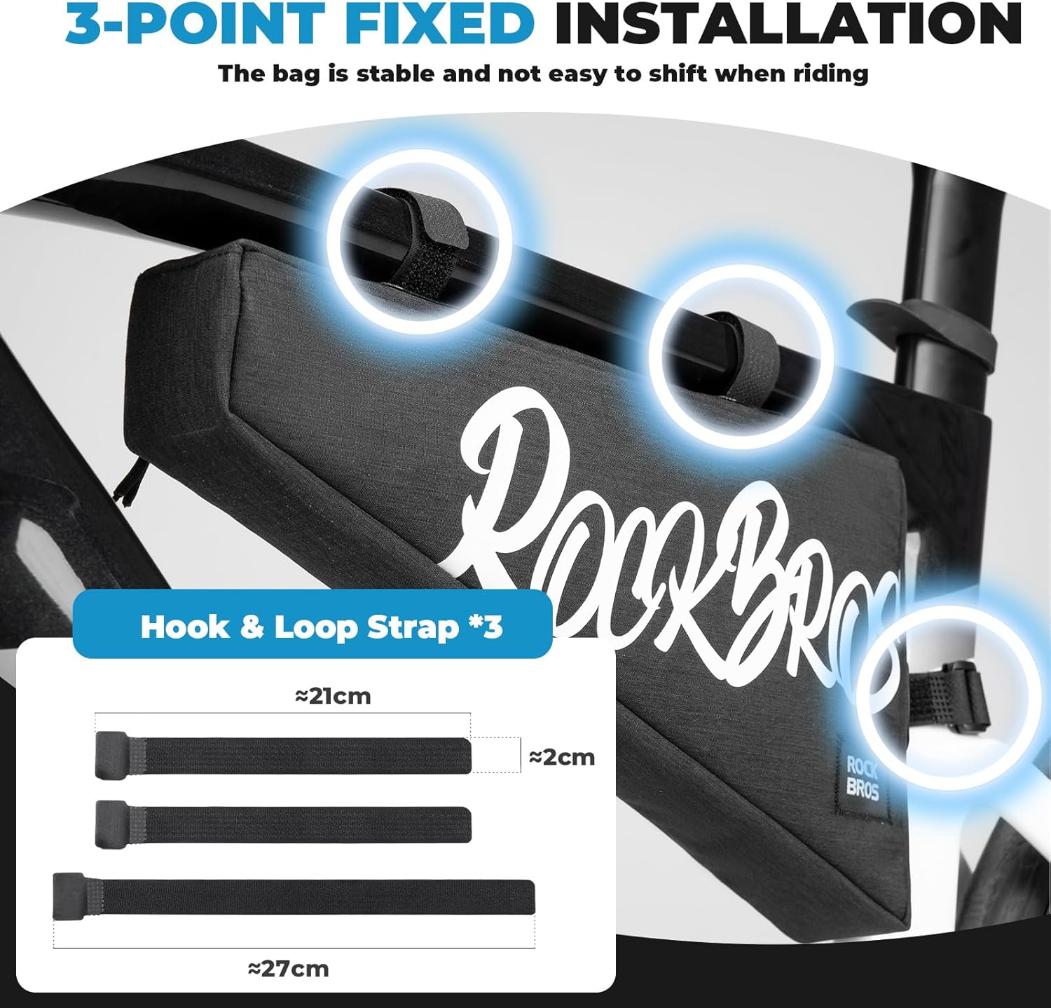 L'installation est rapide et ne nécessite aucun outil supplémentaire. La sacoche se fixe solidement au cadre grâce à trois sangles Velcro. Cette méthode de fixation assure une stabilité remarquable, garantissant que la sacoche reste bien en place même sur les terrains accidentés.