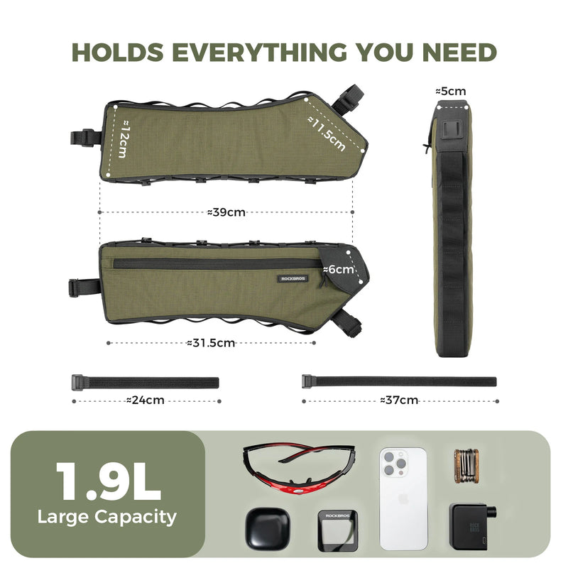 La sacoche ROCKBROS offre une capacité d'environ 1,9 L, suffisante pour stocker votre téléphone portable, lunettes, mini-pompe, outils de réparation et clés. Elle est idéale comme sacoche de tube supérieur pour les vélos de route, les VTT et les vélos hybrides.