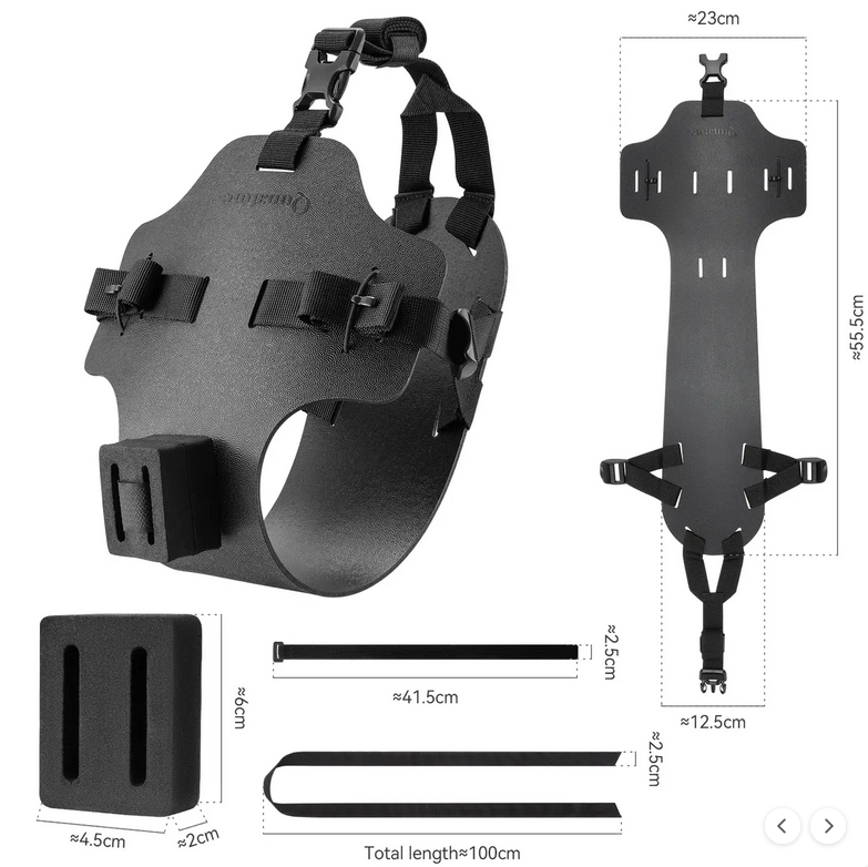 Matériau : Plaque PP (Polypropylène) robuste, sangles renforcées Poids : Seulement 284 g Capacité Supportée : Sacoches arrière jusqu'à 12 L et 54 cm de long Fixation : Système de fixation à trois points avec boucles à dégagement rapide Compatibilité : Vélos de route et VTT. Nécessite un dégagement minimum de 12 cm sous la selle. Entretien : Facile à nettoyer, résistant à la boue et à la poussière.