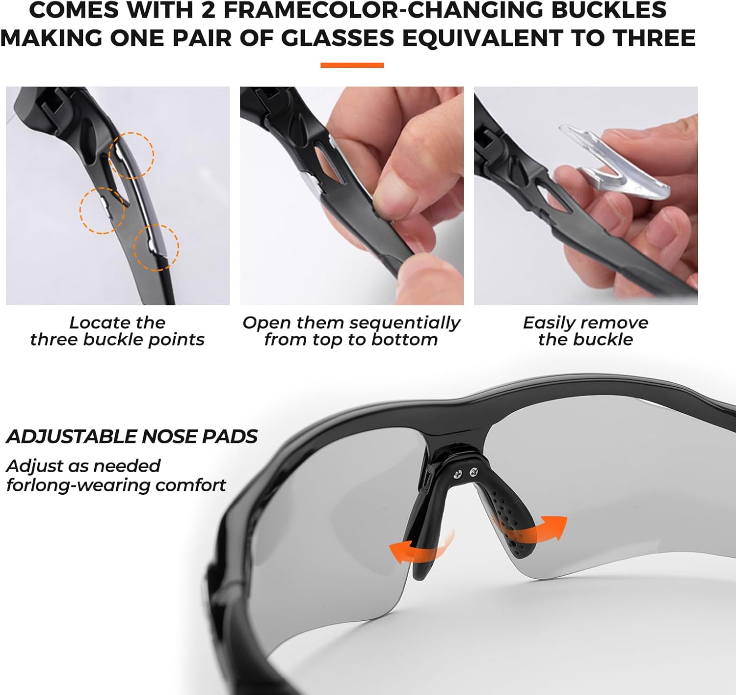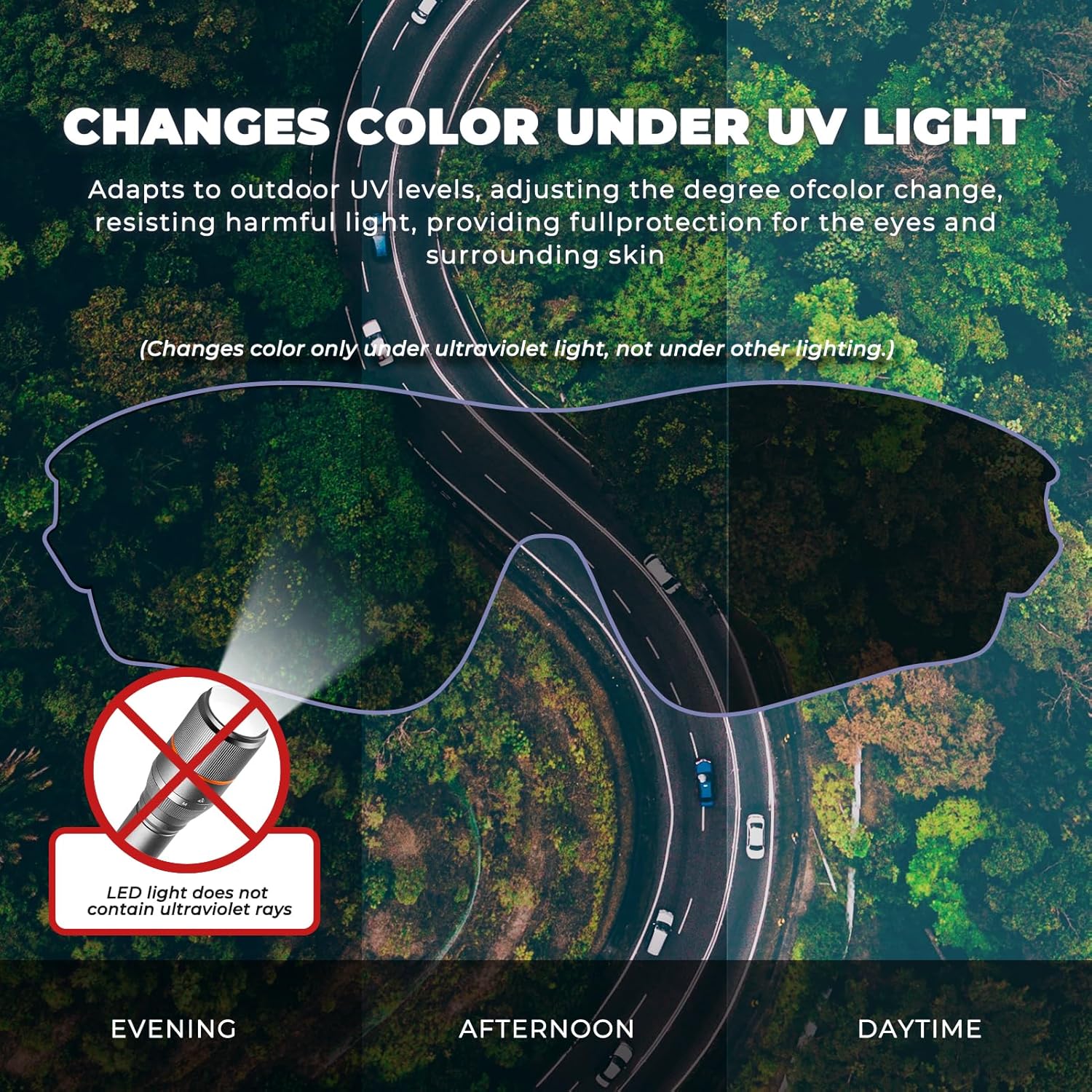 VERRES INTELLIGENTS À DÉCOLORATION ADAPTATIVE : Ces lunettes sont dotées de verres qui s'ajustent dynamiquement à la luminosité ambiante. Ils s'assombrissent en extérieur en fonction de l'intensité des UV et redeviennent clairs à l'intérieur, éliminant le besoin de changer de verres selon l'environnement.